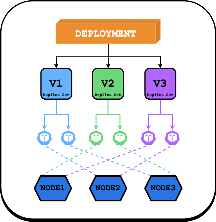 - ReplicaSet: A Deployment doesn’t manage Pods directly. Instead, it creates and manages a ReplicaSet. The ReplicaSet’s job is to make sure the right number of identical Pods are always running. If one fails, it creates a new one to replace it.