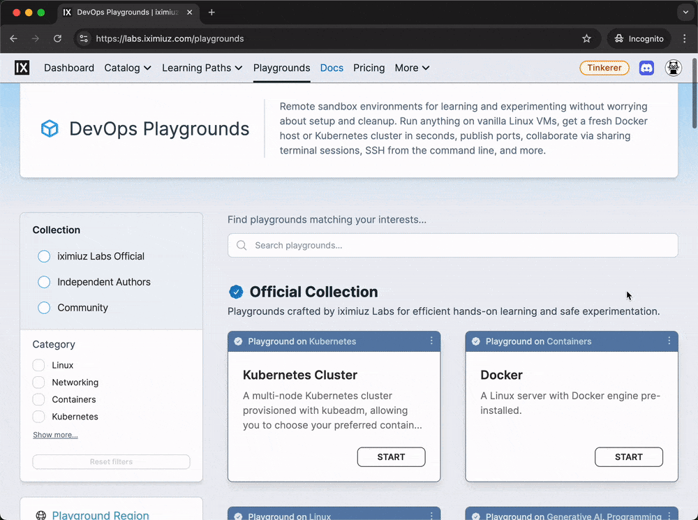 You can use labctl to start and access Linux, Docker, Kubernetes, networking, and other types of playgrounds.