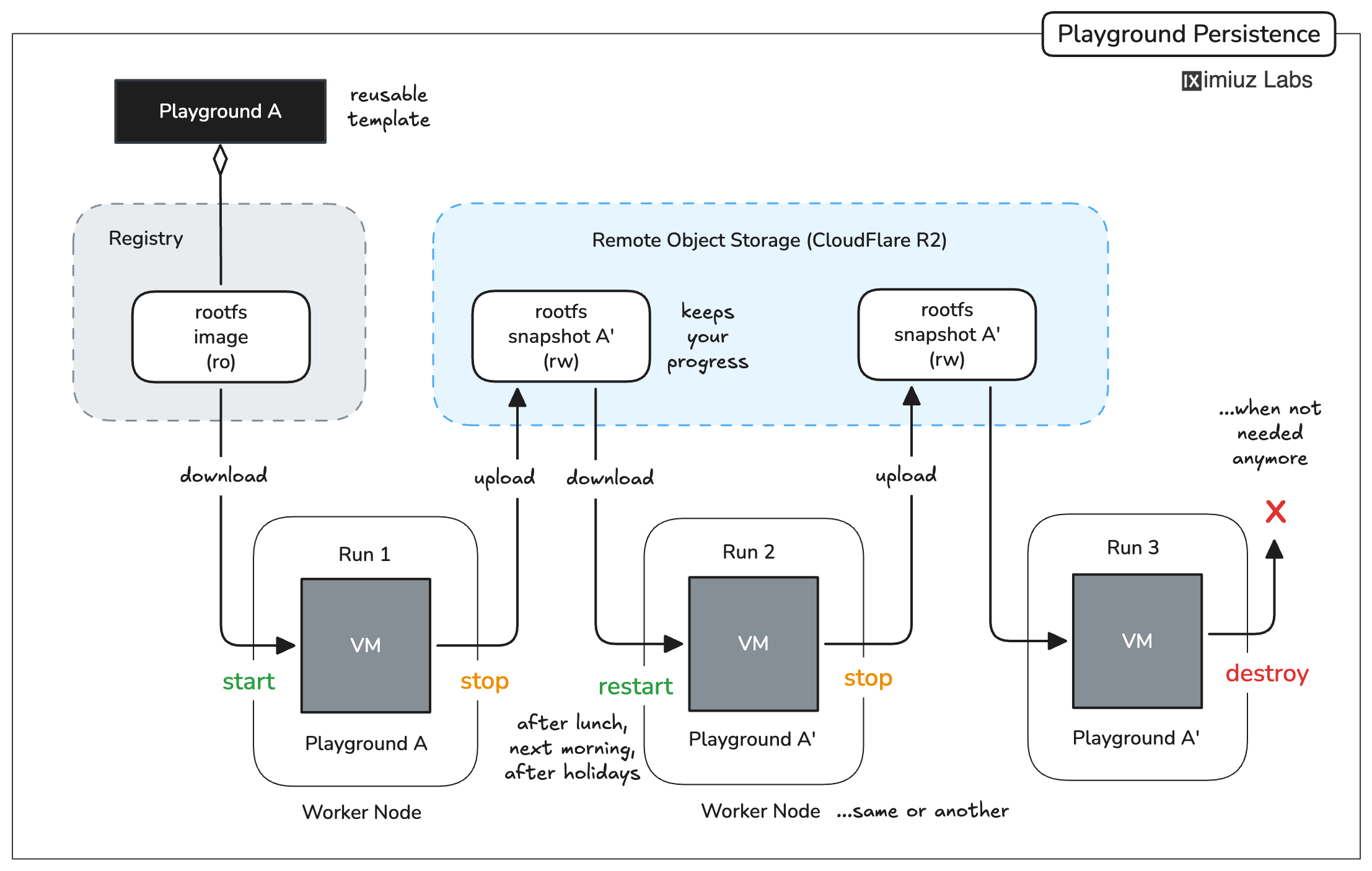 A new playground starts from a read-only rootfs image, but all modifications to the filesystem are preserved in an overlay volume, which is then snapshotted and offloaded to a remote storage.