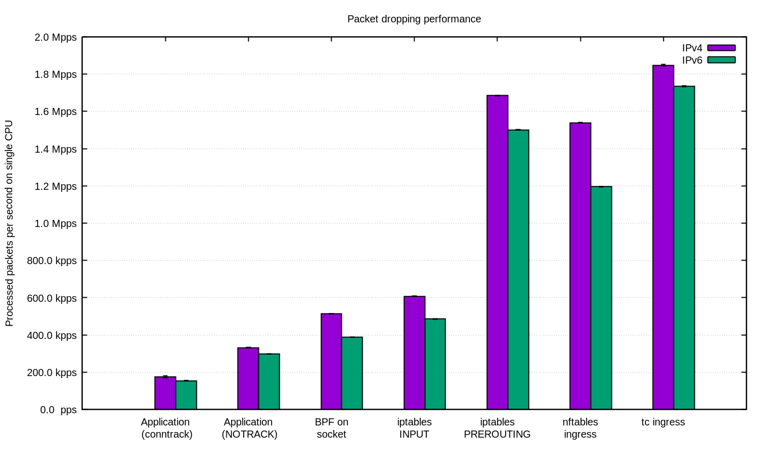 iptables, kendi paket filtreleme sınırlarını PREROUTING zincirinde zorlamasına rağmen ortalama 1.7 milyon paket/saniye (1.7 Mpps) seviyelerinde kalıyor.