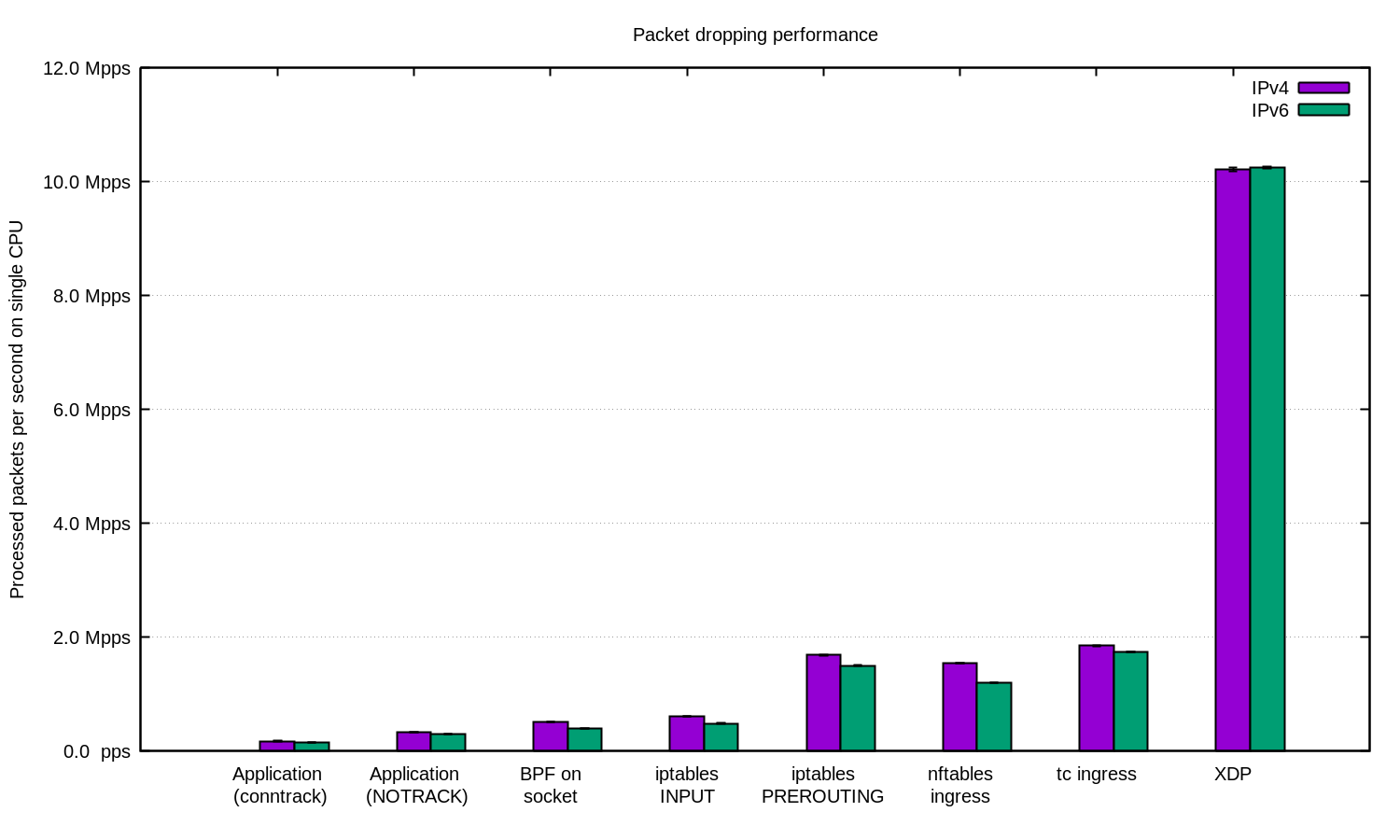 İkinci görselde ise XDP kullanılarak yapılan paket filtreleme işlemlerinin performansını görüyoruz. XDP, Native modunda iken aynı donanım üzerinde ortalama 10 milyon paket/saniye (10 Mpps) seviyelerine kadar çıkabiliyor.