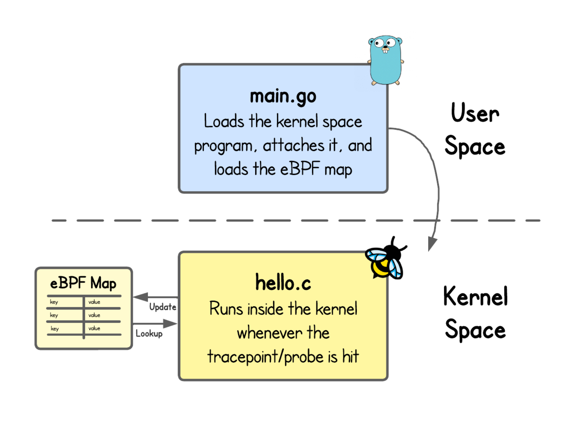 As you can see in the code, our eBPF map stores key/value pairs, where: