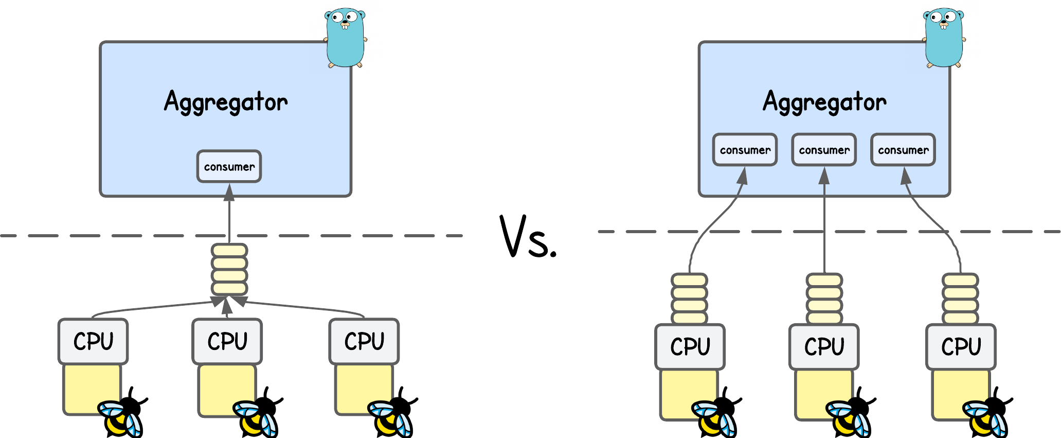 With that in mind, the first additional optimization one can do is, offload the processing of those events to "worker threads" (actually goroutines), ensuring that consumption in user-space itself remains fast and non-blocking: