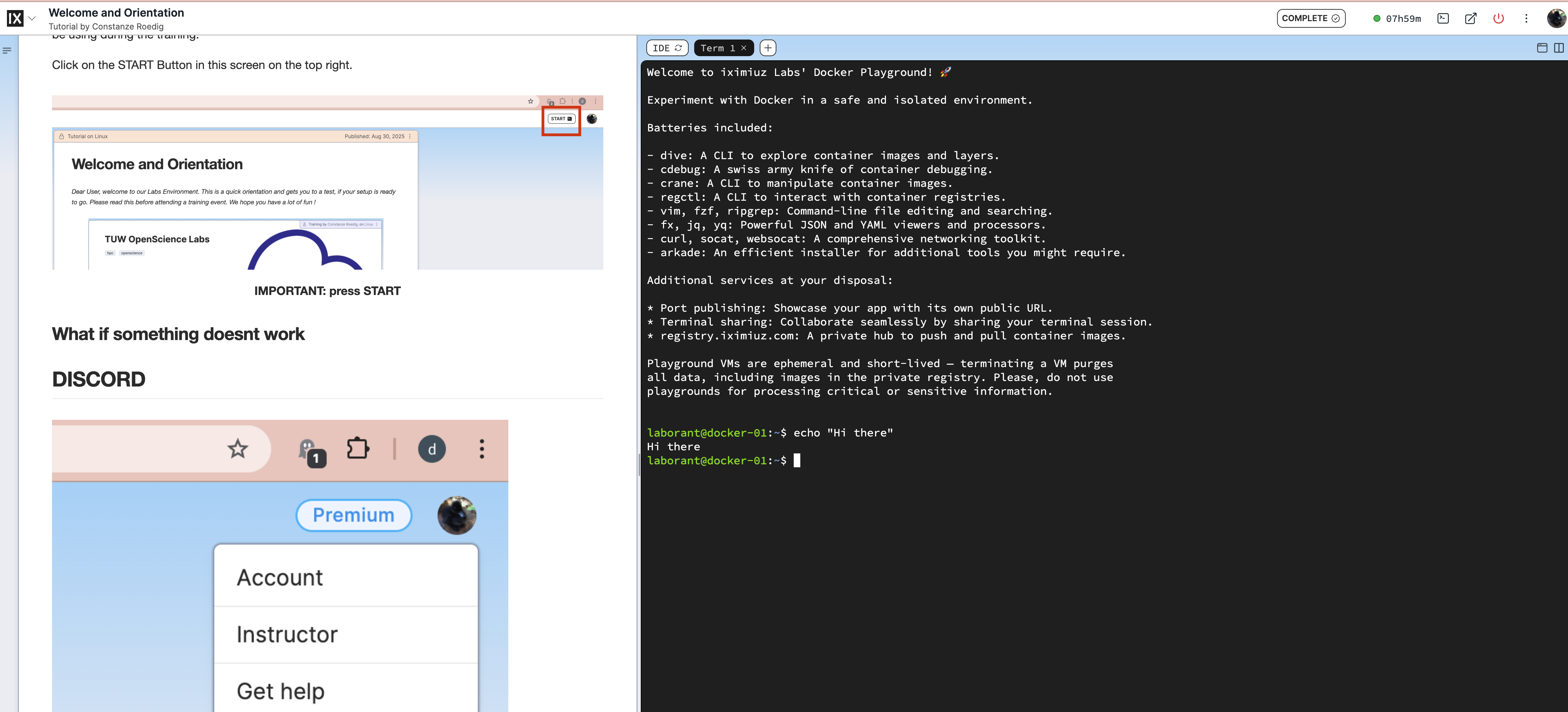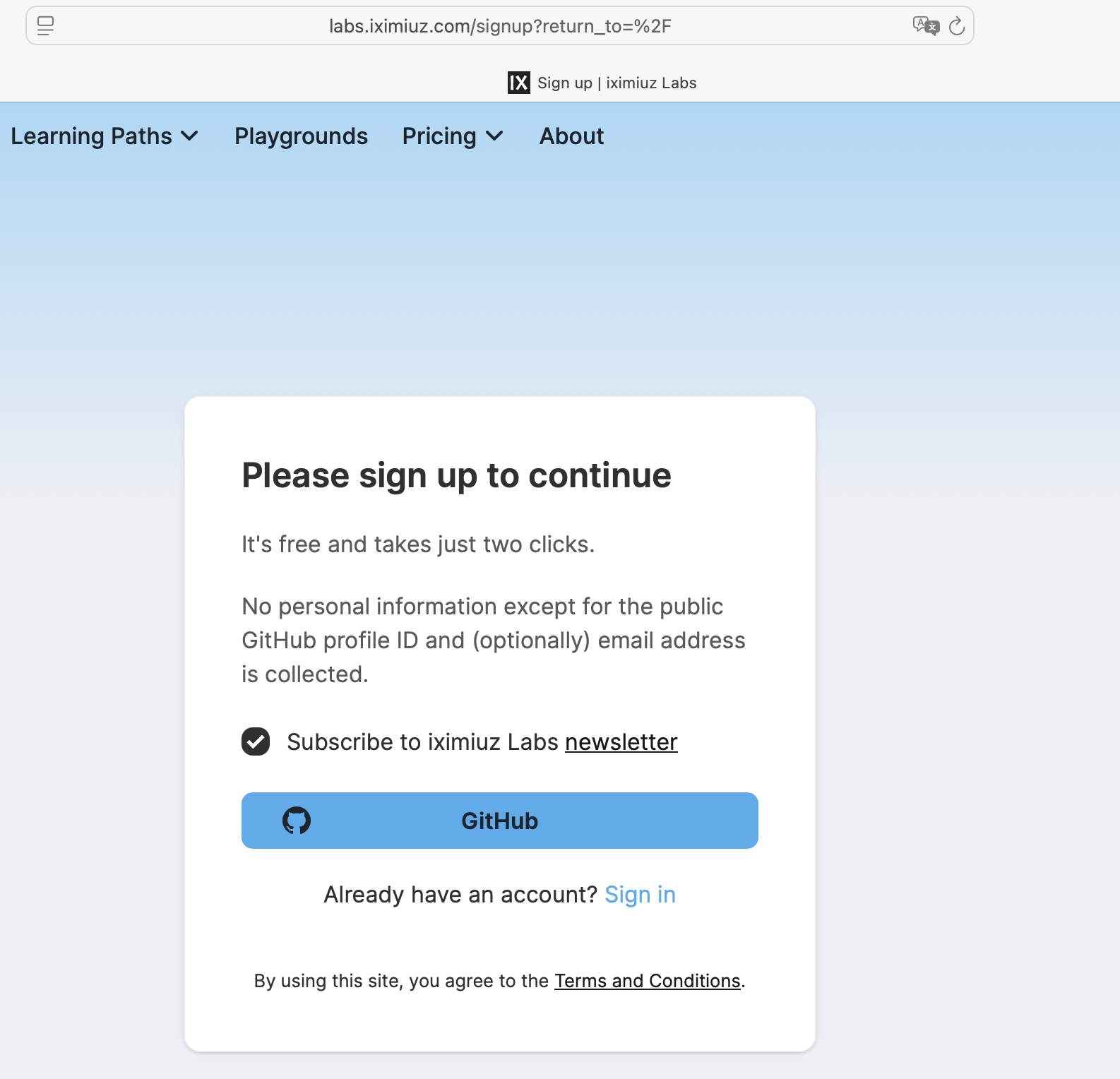 If you do not have a GitHub account, you will have to open one before signing up. Sometimes, it can also happen that a freshly created iximiuz Labs account is flagged as suspicious. If after the signup, you see an error mentioning "Bot protection: ...", make sure you joined the training (see below) and your request was approved by the instructor.